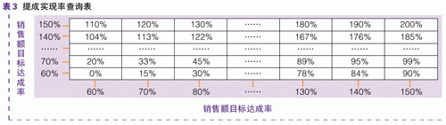 销售人员实际提成额的计算方法是目标提成额乘以提成实现率。其中,目标提成额由员工标准工资乘以不同系数来确定,系数值取决于公司规定的销售提成占销售人员总薪酬的比例。提成实现率从销售额目标达成率和销售价格实现率这两个维度来考虑,这可避免单纯以销售数量为唯一考核指标的弊端。具体数值如表3所示。