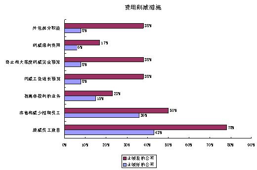 严峻的经济环境迫使公司不得不在控制员工费用方面采取积极的措施,多数公司在削减员工费用方面相当谨慎,但经济形势还是迫使公司采取这方面的做法,我们在调查中将公司分为两类:财务业绩好的公司、财务业绩差的公司,它们在削减费用方面的做法如下图: