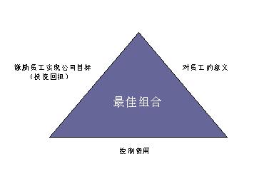 员工奖酬不仅包括货币化报酬,也包括非货币化的报酬,对公司而言,它们都是公司对员工的回报。调查结果发现同时采用多种奖酬措施是非常重要的,关键在于取得各种奖酬措施的最优组合,即以最合适的费用、以最恰当的支付形式、激励员工为实现公司业务目标取得最佳业绩。也就是讲,报酬要从员工和公司两个角度同时进行分析,从员工角度讲,如何使报酬的数量、报酬的形式更符合员工的实际需要;从公司角度讲,如何控制费用和如何激励员工取得上佳业绩,也就是如何取得在投资的最佳效益(如下图示)。